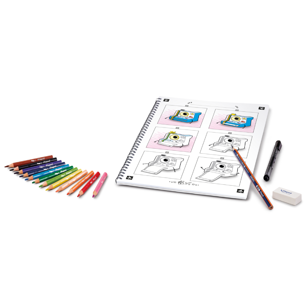 12 lápis de cor + 1 caderno de desenhos animados para criar em cada caixa.