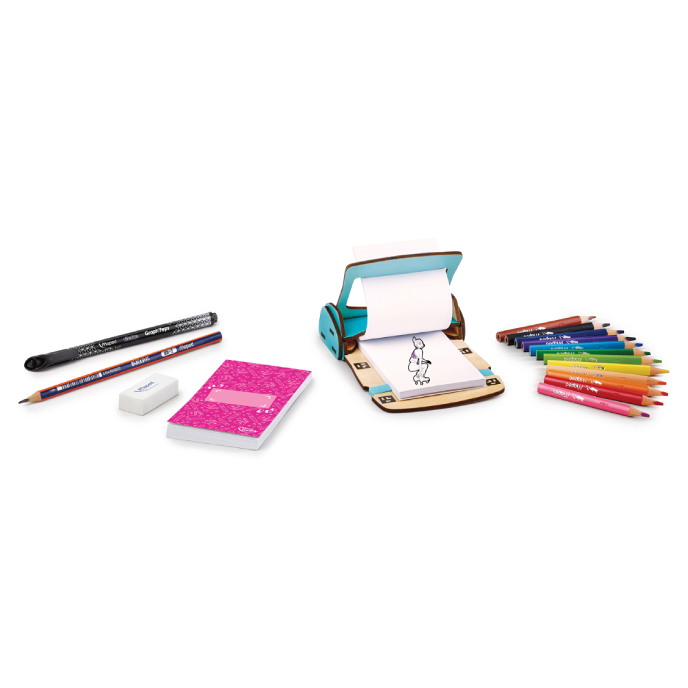 As crianças podem colorir e completar suas próprias histórias para resultados únicos e surpreendentes, para guardar ou compartilhar! Elas aprenderão os conceitos básicos da animação. Todos os acessórios necessários estão inclusos nesta caixa para criar animações. O FlipbookTool pode ser usado com qualquer flipbook de tamanho padrão. 4 mini desenhos animados para criar em cada caixa.