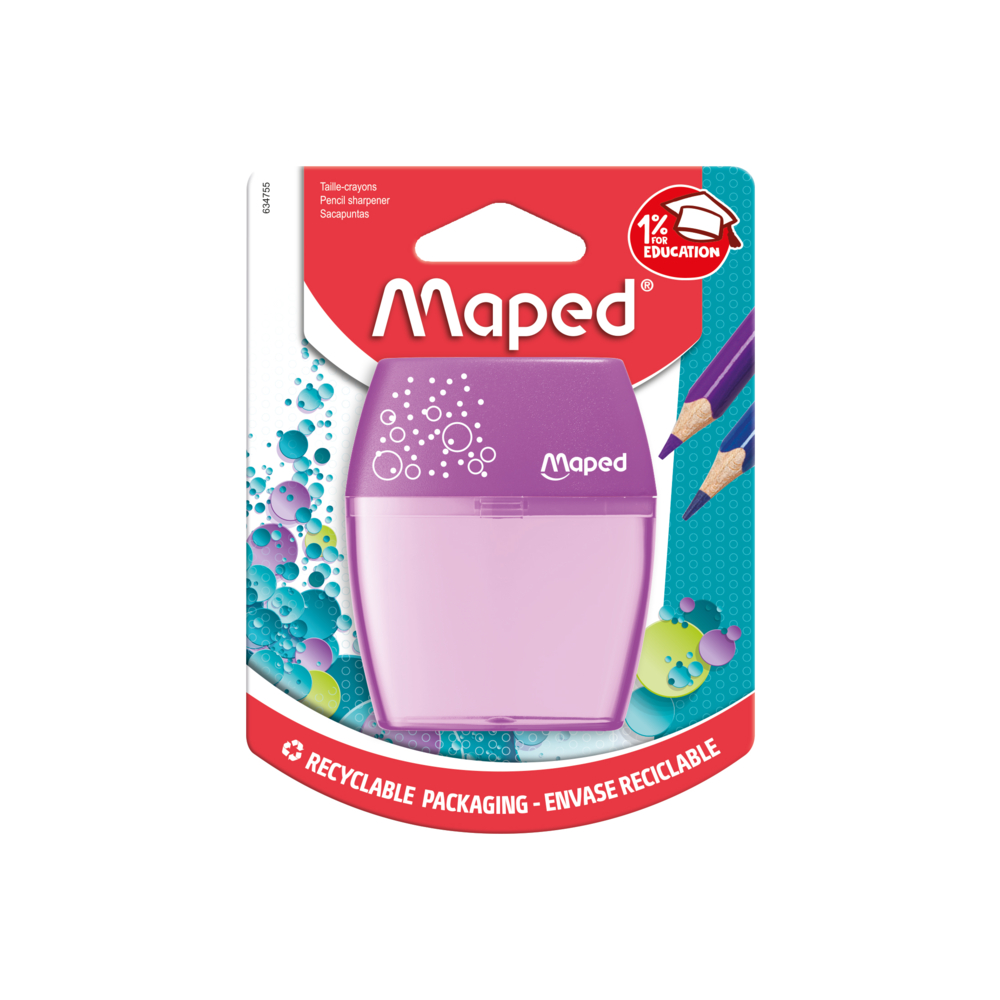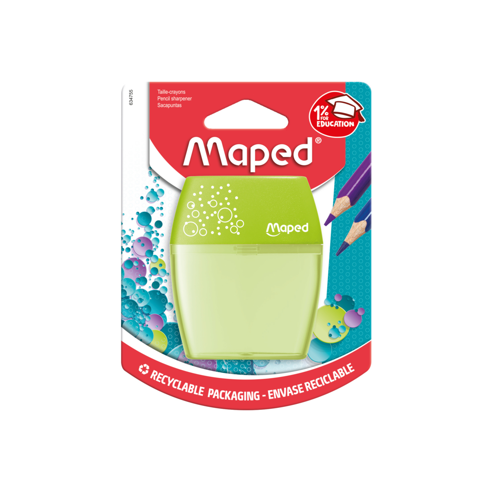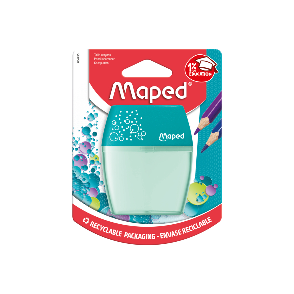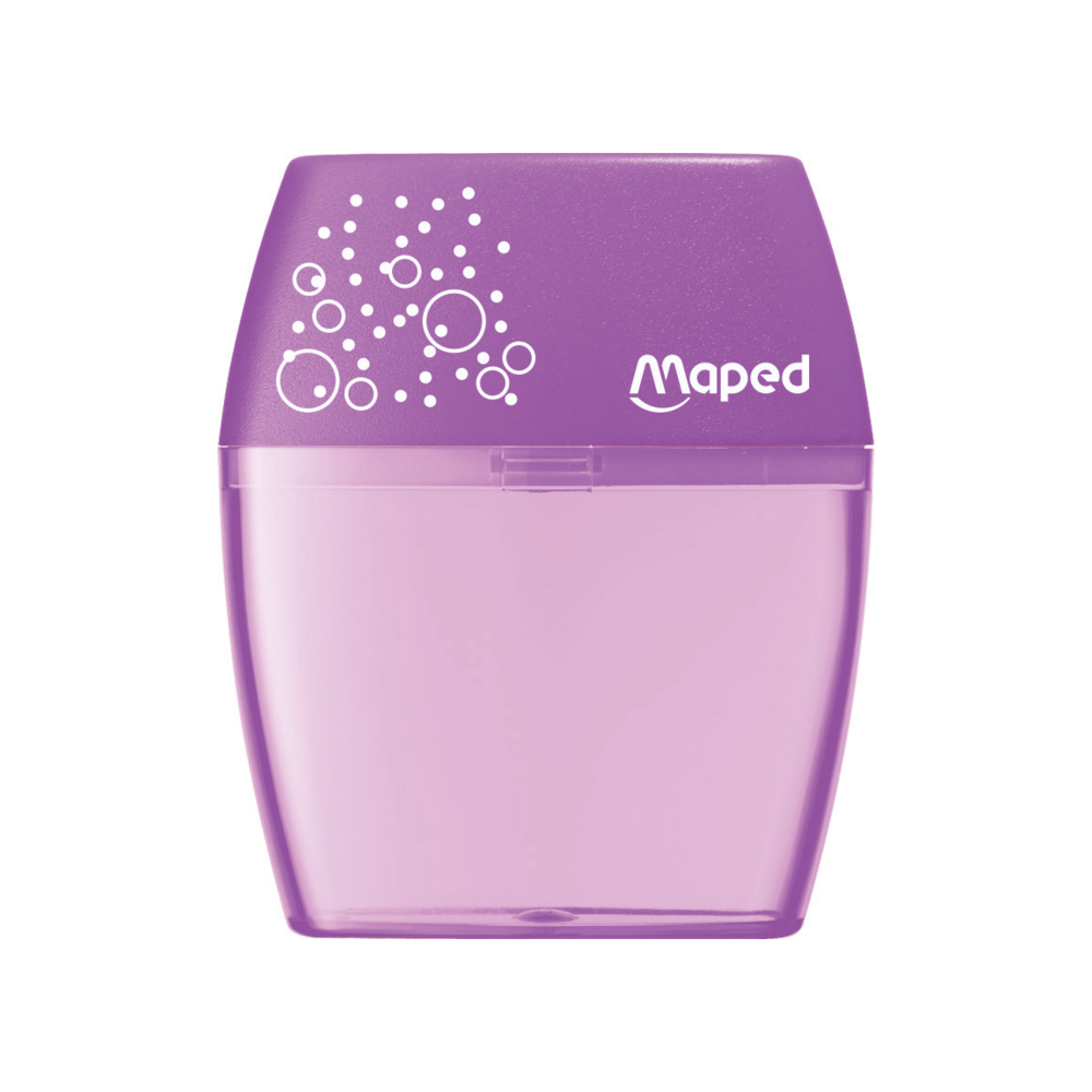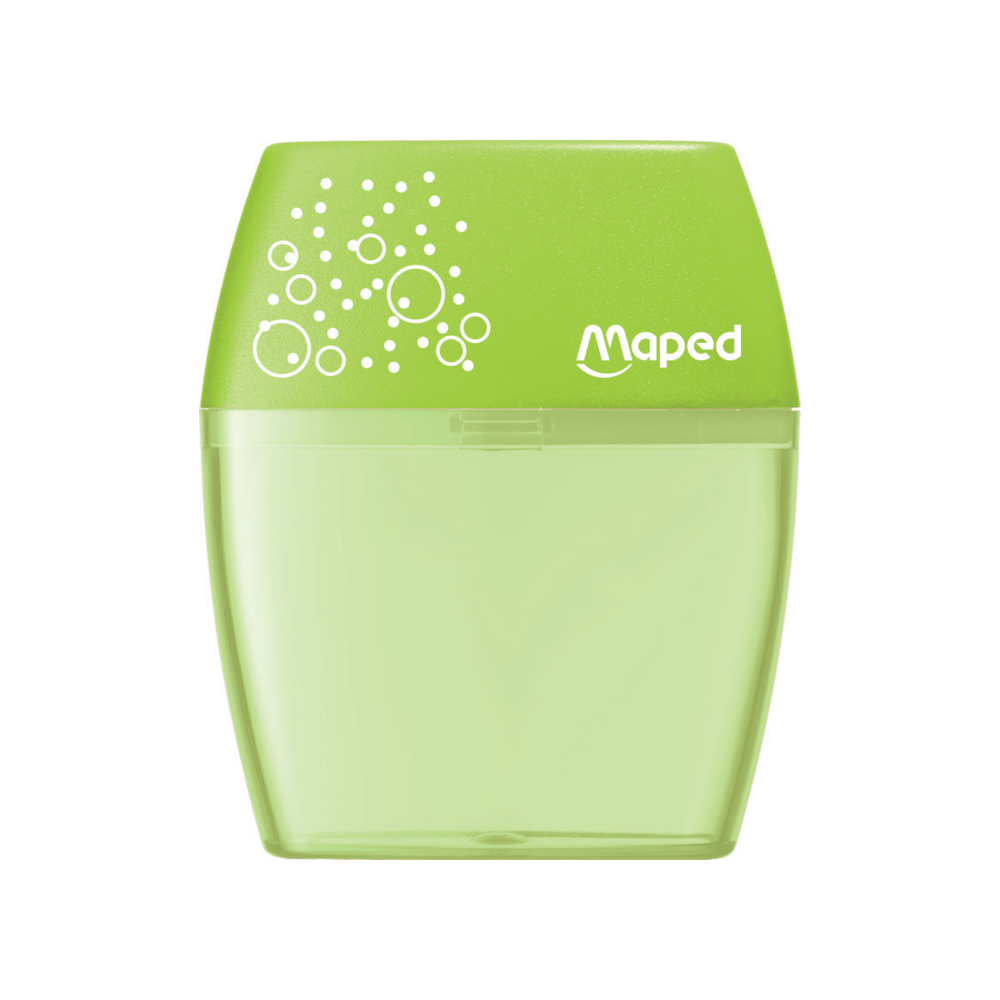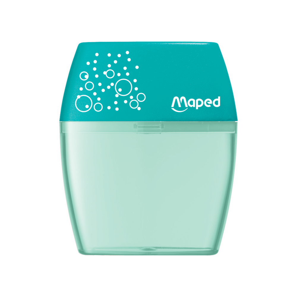 O Shaker, o apontador de lápis mais vendido da Maped!   Compacto e fácil de transportar no seu estojo, este apontador de dois furos é ergonomicamente projetado para facilitar o uso.   Além disso, possui um reservatório transparente que permite afiar os lápis de forma limpa, evitando resíduos no fundo do estojo. Com um reservatório grande, você pode afiar os lápis várias vezes antes de precisar esvaziá-lo.