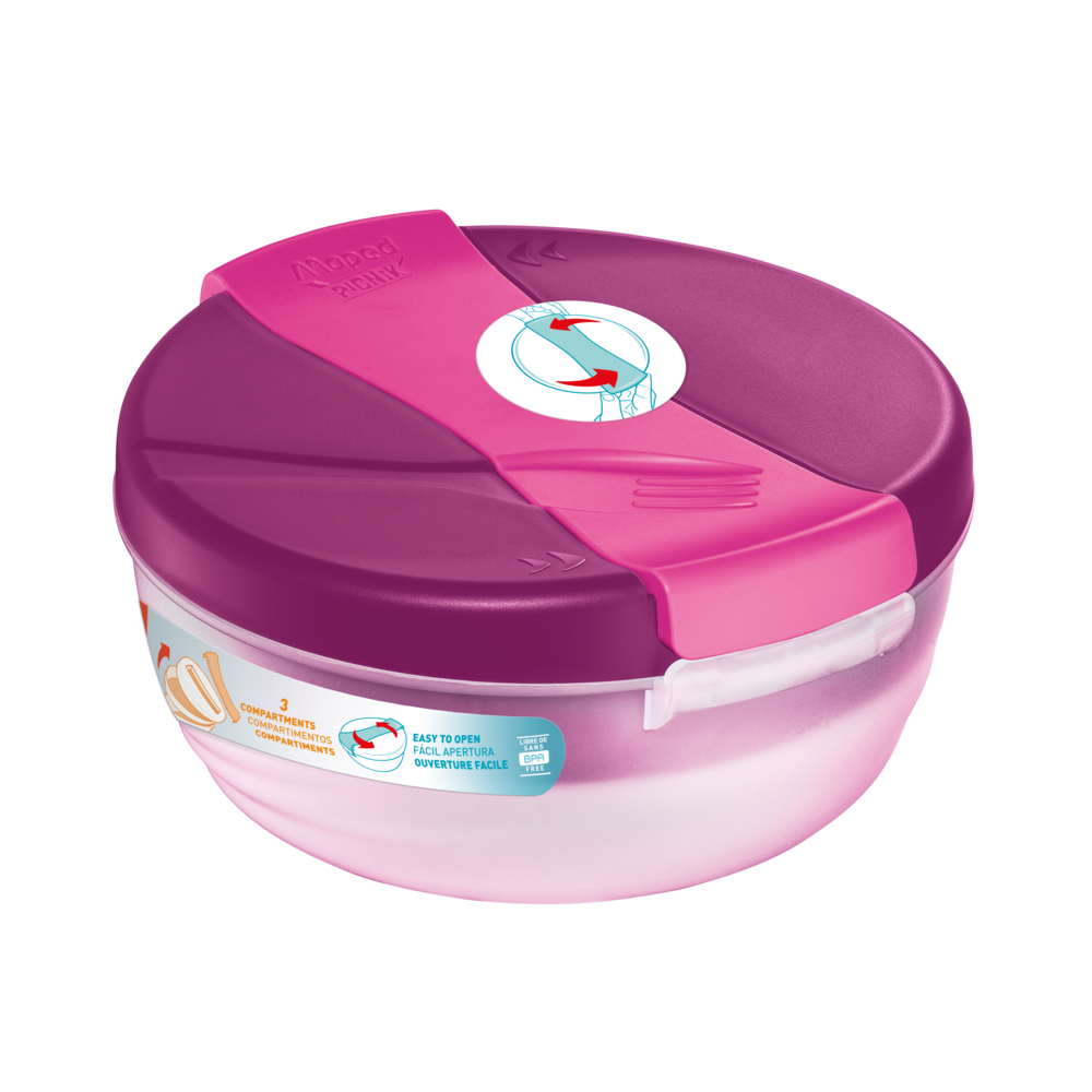 Com três compartimentos – uma tigela principal, uma bandeja interna removível e um espaço na tampa – oferece amplo espaço para organizar sua refeição.