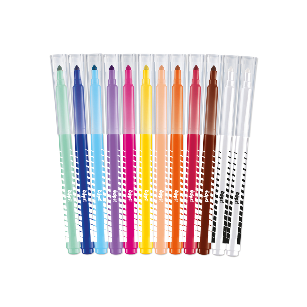 Desde desenhar em casa até colorir na escola, essas canetas de feltro coloridas acompanharão seu filho(a) em todos os lugares! Além disso: incluídas 2 canetas de feltro apagáveis que permitirão às crianças corrigir seus erros ou criar desenhos únicos!
