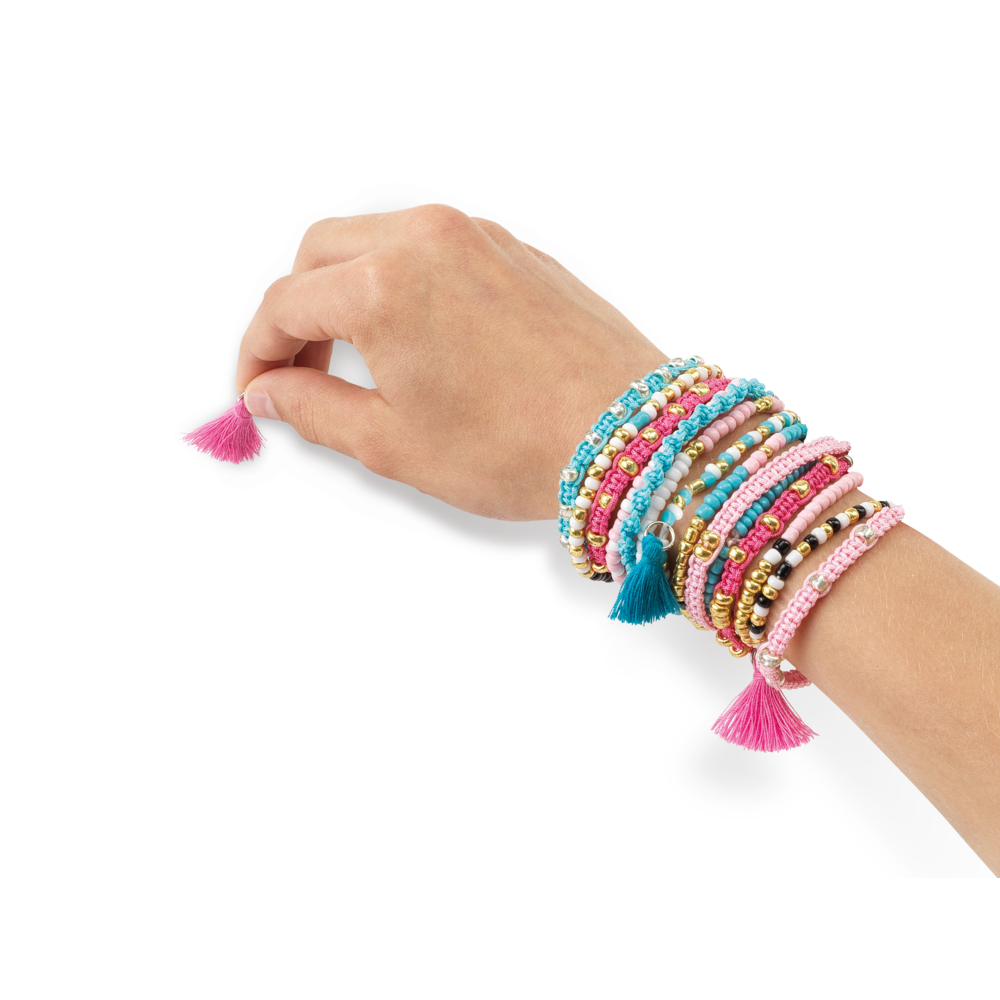 Imagine criar seu próprio estilo com duas técnicas de criação de pulseiras! Combinando fios, miçangas e pingentes, você pode criar 16 pulseiras com um visual moderno. Esta atividade de pulseiras é perfeita para crianças: Trançado guiado com a caixa e técnica de nó único Pulseiras de miçangas e pingentes fáceis e rápidas de fazer