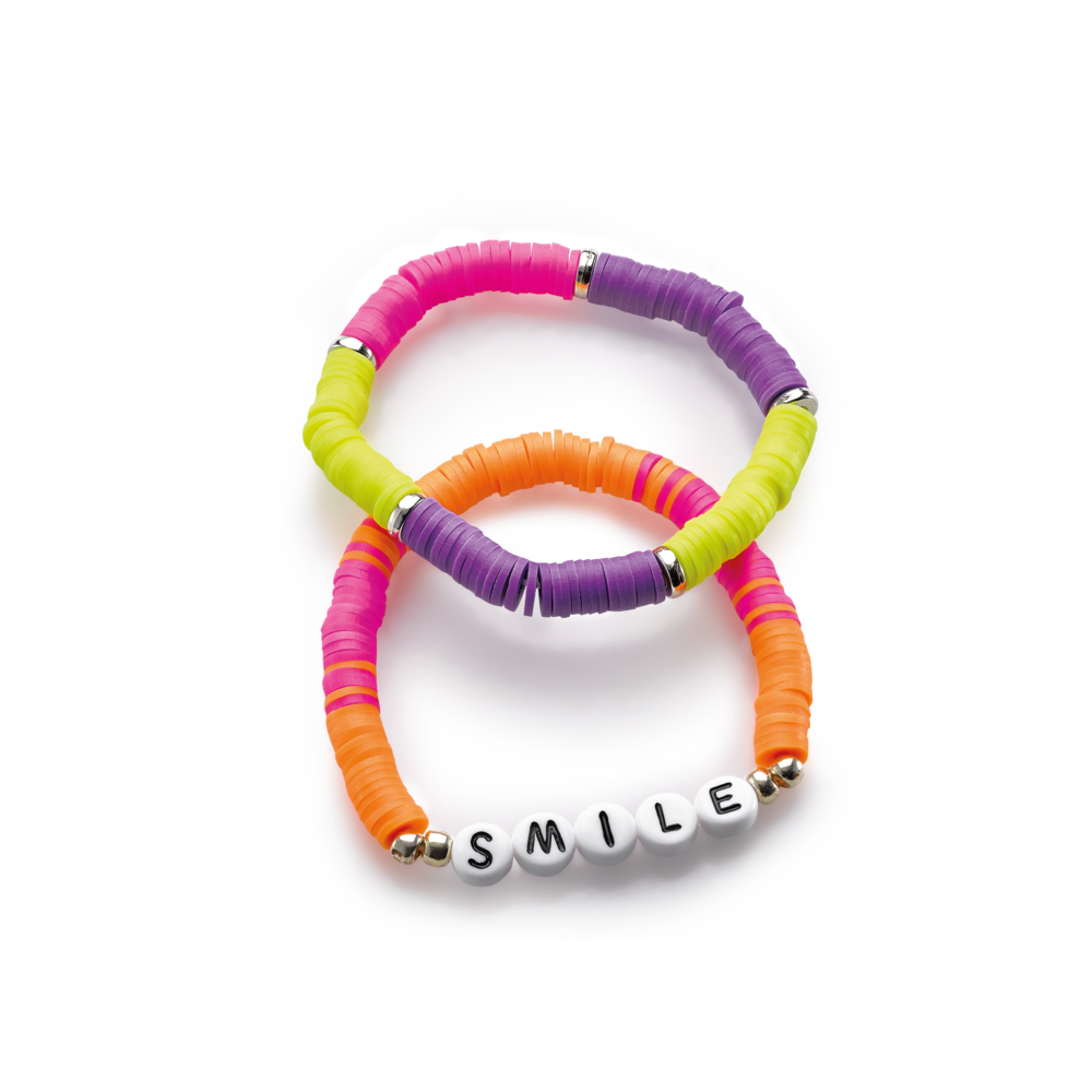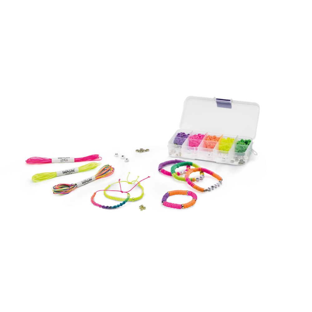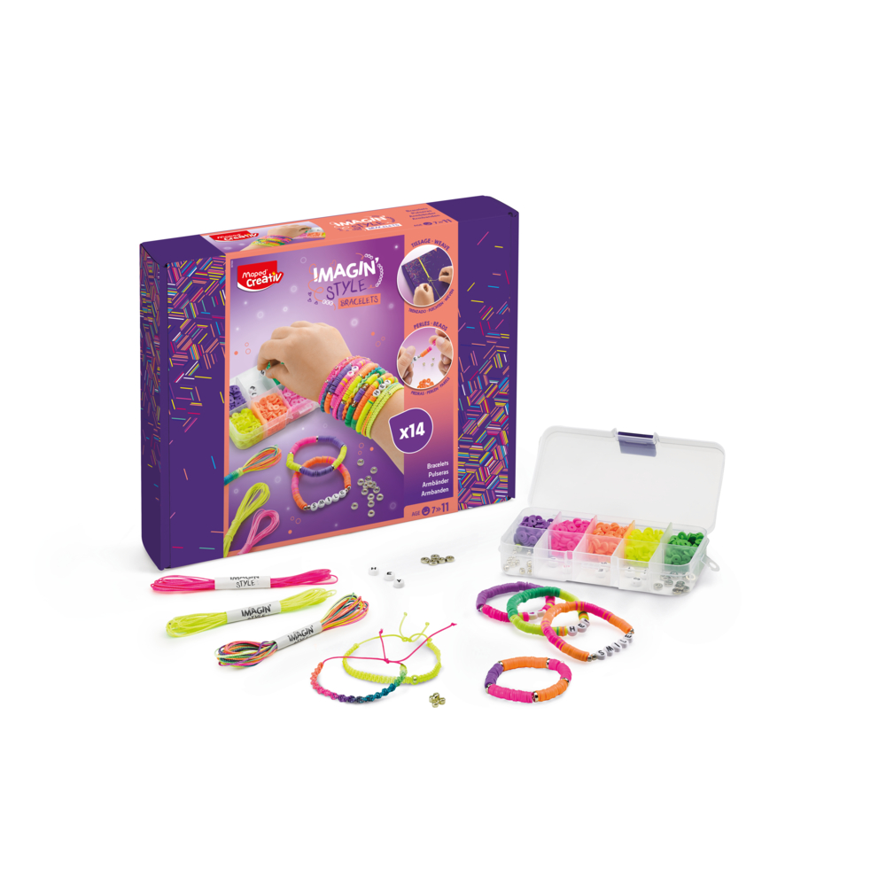 Imagine seu próprio estilo graças a duas técnicas de criação de pulseiras. Combine fios, miçangas e pingentes para criar 14 pulseiras com um visual neon moderno.