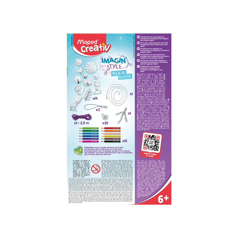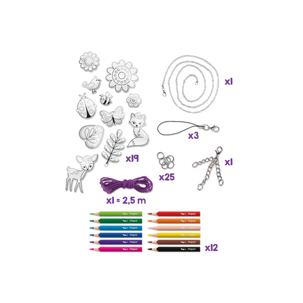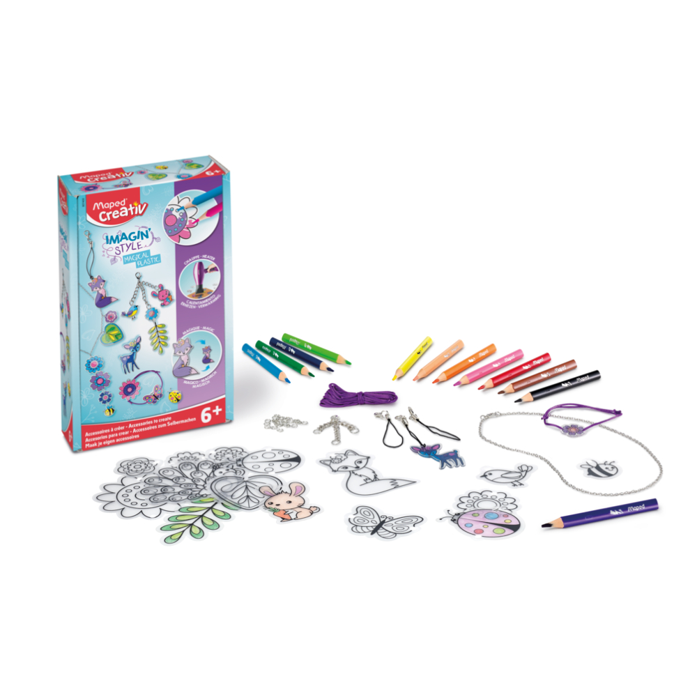 Transforme suas colorações em acessórios modernos e crie seu próprio estilo! Fácil e mágico: a coloração encolhe, torna-se sólida e brilhante para um resultado garantido! Encolhimento espetacular! Único: pode ser feito com um secador de cabelo; não é necessário usar um forno para encolher (mas o uso de forno também é possível) Conjunto completo para a criação de acessórios modernos: colar, pulseiras, decorações para estojo de lápis, chaveiros Inclui 12 mini lápis de cor Maped Strong: minas resistentes de 3,2 mm