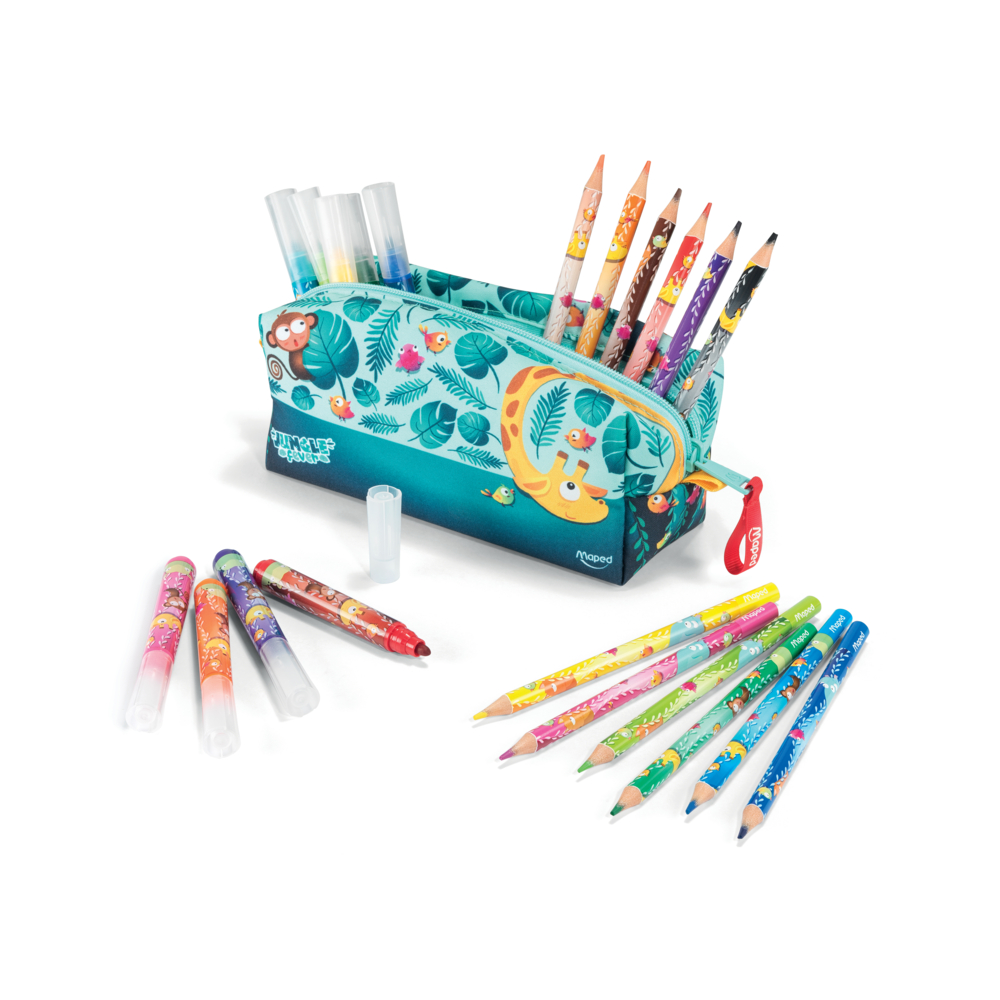 Este estojo de lápis de poliéster com tema de selva contém 12 lápis de cor Jumbo e 12 canetas hidrográficas Jumbo da coleção Jungle Fever
