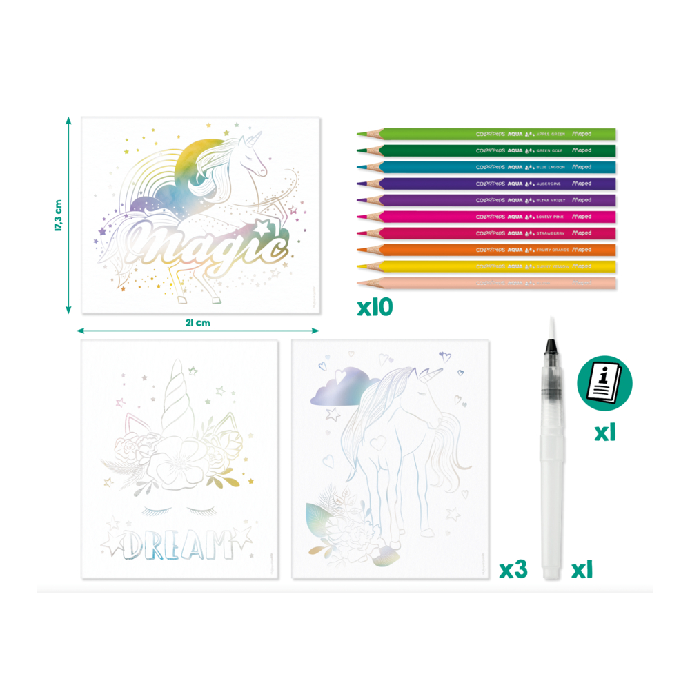 Encante-se com a magia e a criatividade com o Kit De Pintura Aquarelável - O Mágico Mundo Dos Unicórnios da Maped! Este kit encantador é perfeito para crianças que adoram unicórnios e sonham com um mundo cheio de cores e fantasia. O kit inclui uma paleta de aquarelas vibrantes, pincéis de alta qualidade e folhas de papel com lindas ilustrações de unicórnios e paisagens mágicas.