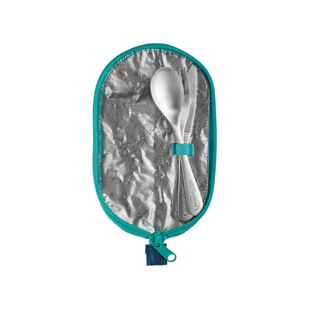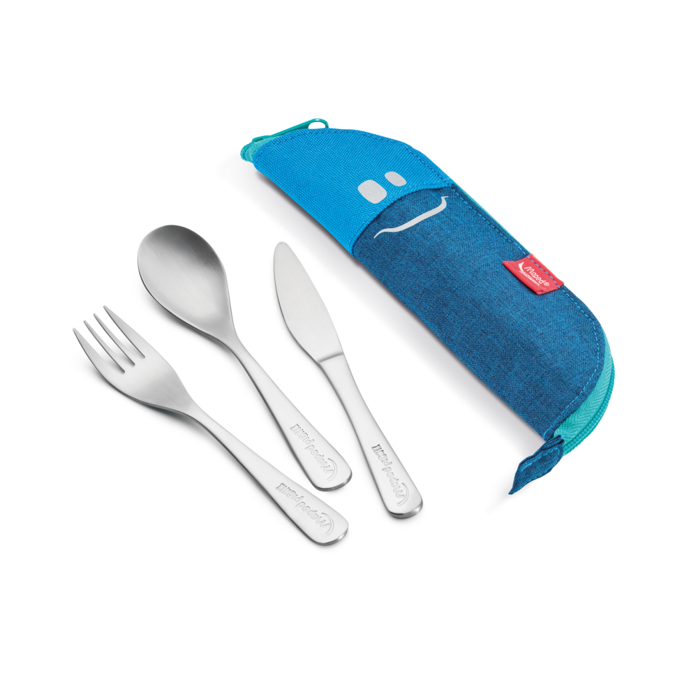 Além de ser fácil de limpar com uma esponja devido ao revestimento interior, inclui garfo, faca e colher em aço inoxidável – todos seguros para lava-louças. Seu tamanho compacto permite que os talheres sejam guardados dentro das lancheiras após o almoço, mantendo tudo organizado e prático. Prepare-se para adicionar um toque de alegria ao transporte dos talheres!