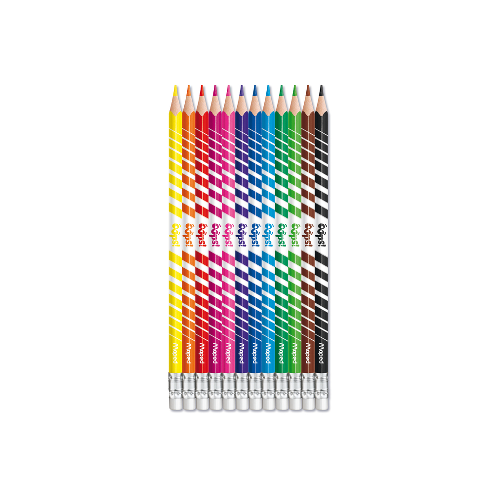 Pacote com 12 lápis de cor apagáveis feitos de resina Maped. Graças à sua ponta apagadora, o lápis Maped Oops Color'Peps é muito fácil de apagar. As crianças poderão corrigir qualquer traço de coloração ou enriquecer seus desenhos.