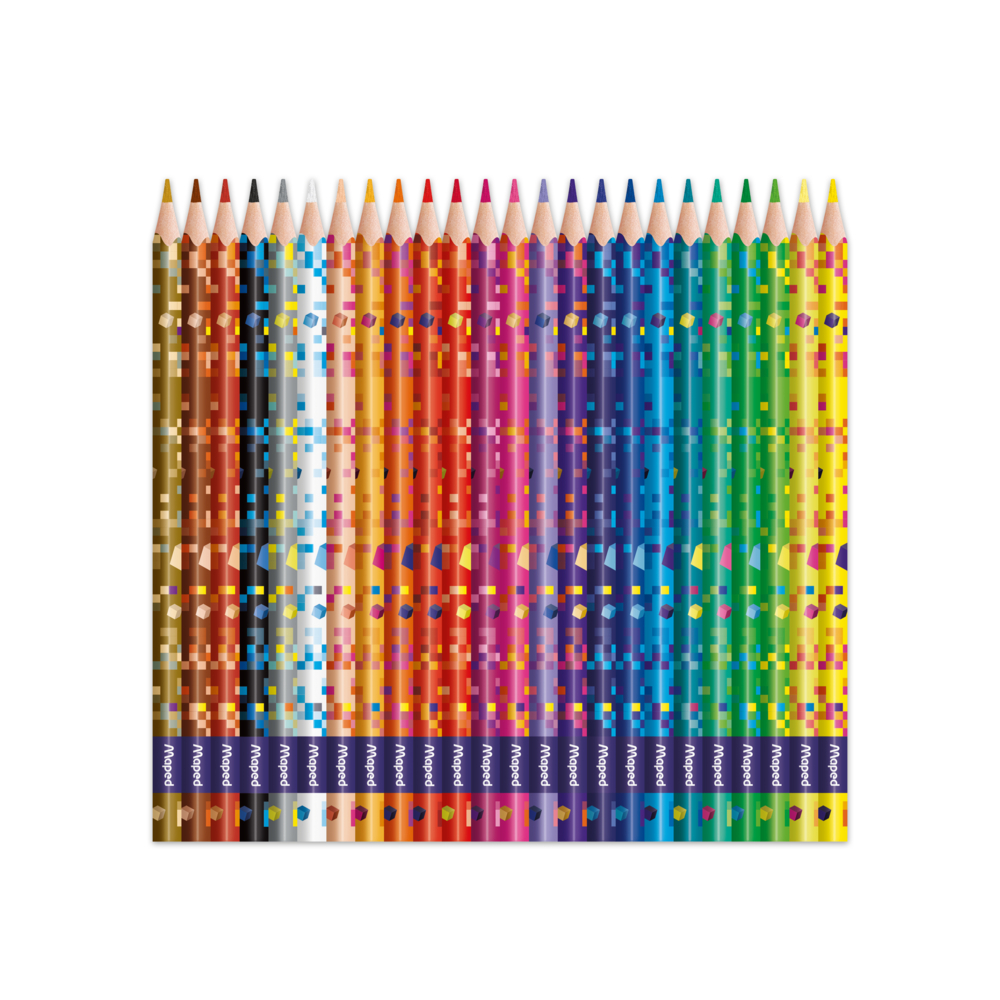 Lápis de cor triangular para uma aderência fácil e confortável. Fácil de apontar. Cores vibrantes. Lápis 0% madeira. Diâmetro padrão da ponta: Ø 2.9 mm. Mergulhe em um cenário retro-futurista inspirado em códigos de jogos com a nova coleção Maped: Pixel Party!