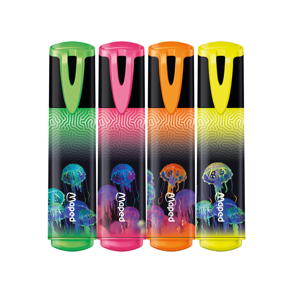 Marcadores de texto com cores ultra brilhantes! Com os marcadores Maped, precisão e eficiência estão garantidas. As pontas biseladas extra macias permitem que você desenhe linhas de 1 a 5 mm de espessura.