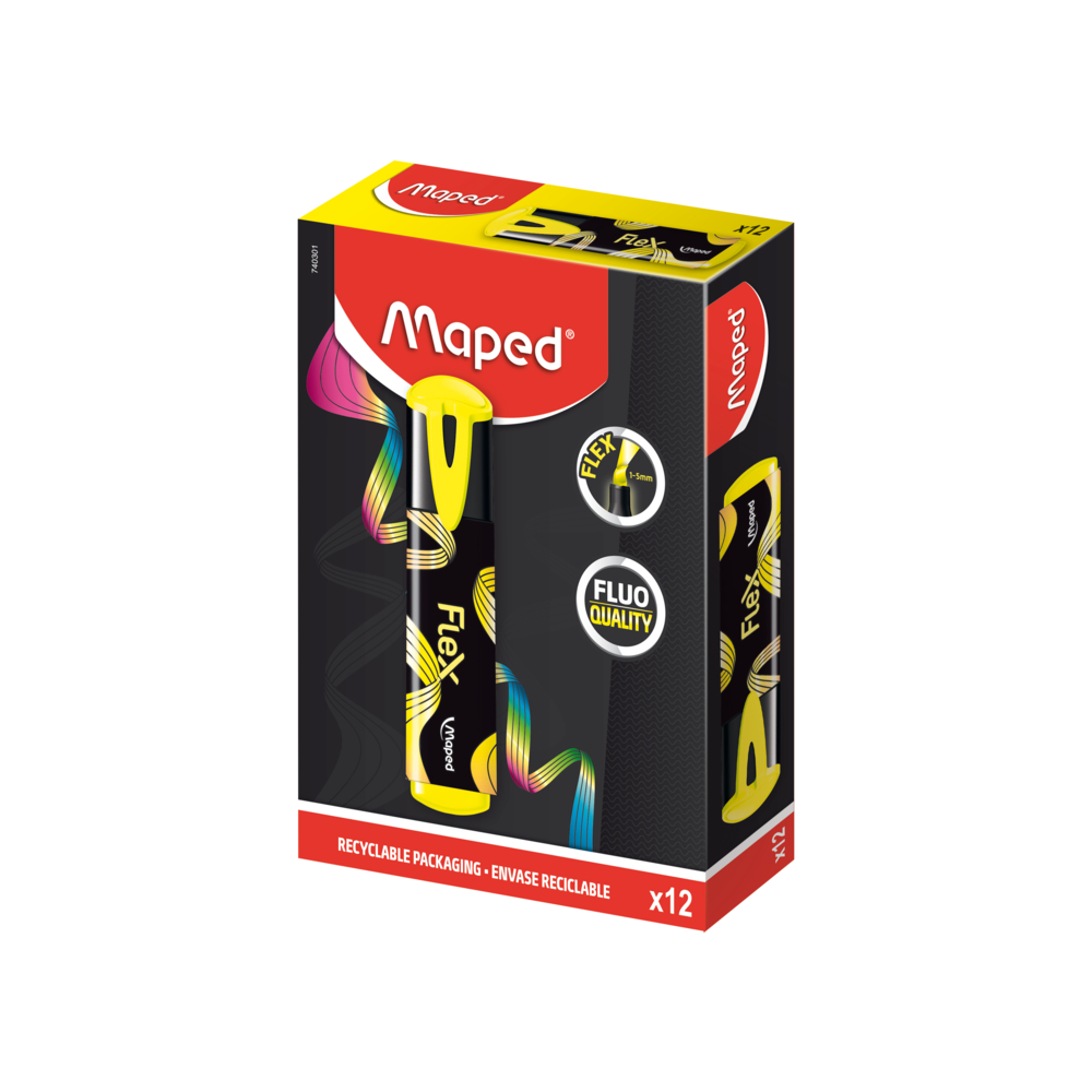 Marcadores de texto modernos com ponta flexível! Graças ao marcador de texto Maped Fluo Flex, você pode optar por um conforto excepcional ao destacar.