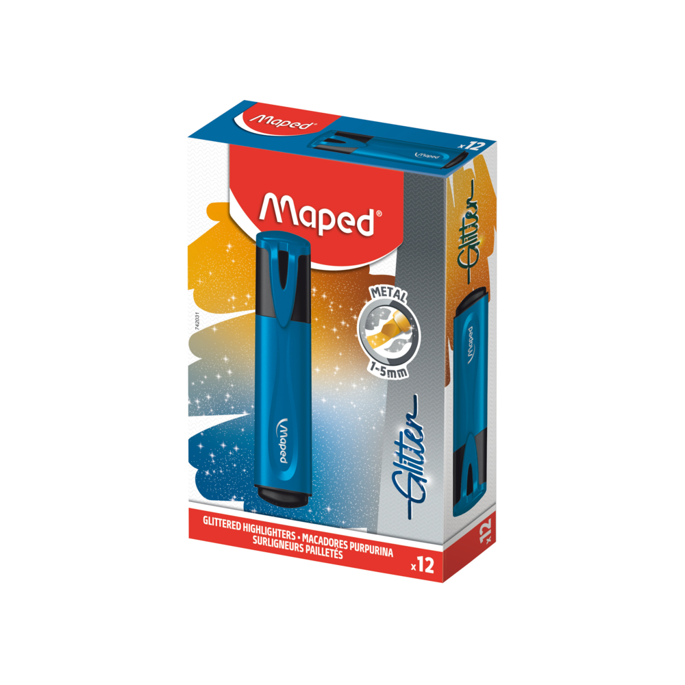 Esta caixa contém 12 marcadores de glitter azul. Os marcadores de glitter clássicos da Maped são únicos e originais.
